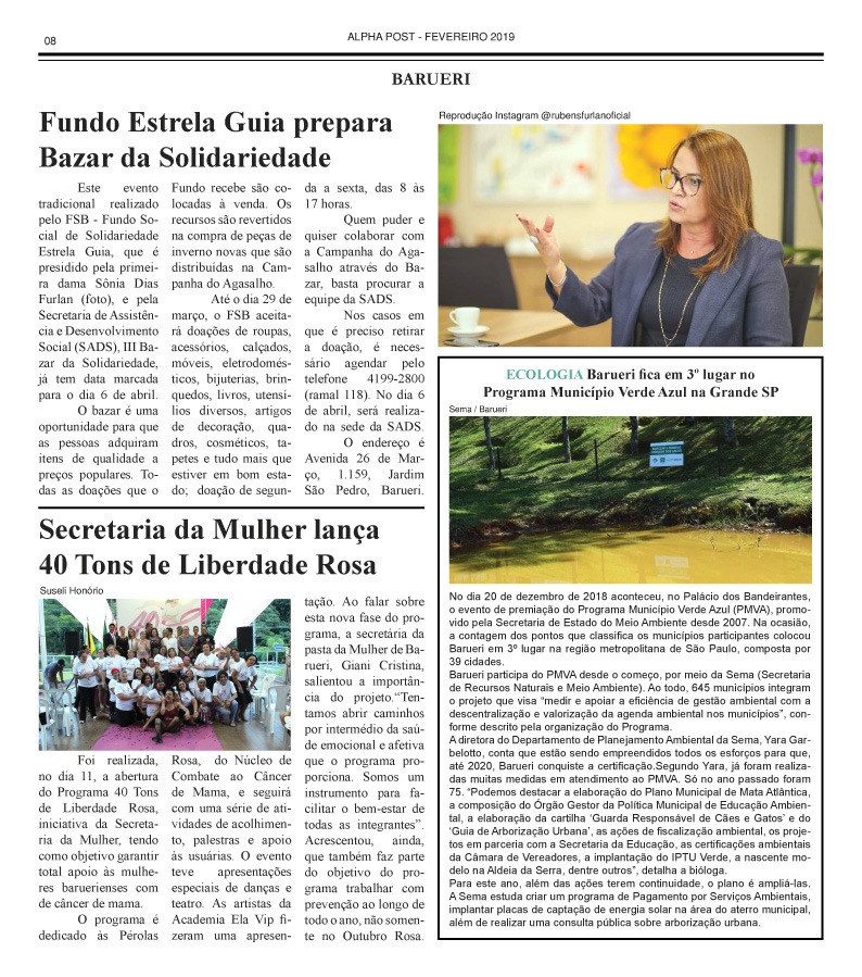 Alpha Post de fevereiro. Leia aqui, o melhor resumo mensal de notícias de Alphaville! Tabloide, onde menos é mais! fevereiro 25, 2019 12:01 am by: Gláucia Poppe Category: Alphaville, Barueri, Brasil, Santana de Parnaíba A+ / A- Sugestão da editora: Clique na imagem e dê zoom para ler.