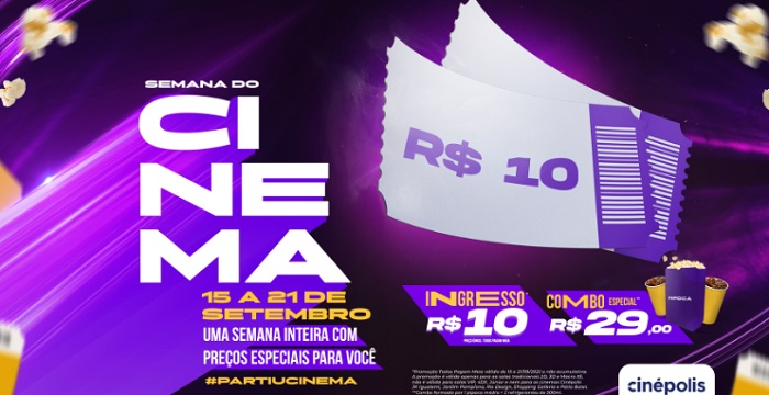 A Semana Especial acontecerá de 15 a 21 de Setembro, nas salas 2D, 3D e Macro XE da Cinépolis, o preço do ingresso será de apenas R$ 10,00. Tem, também, preço especial no Combo, pipoca + 2 refrigerantes por R$ 29,00.